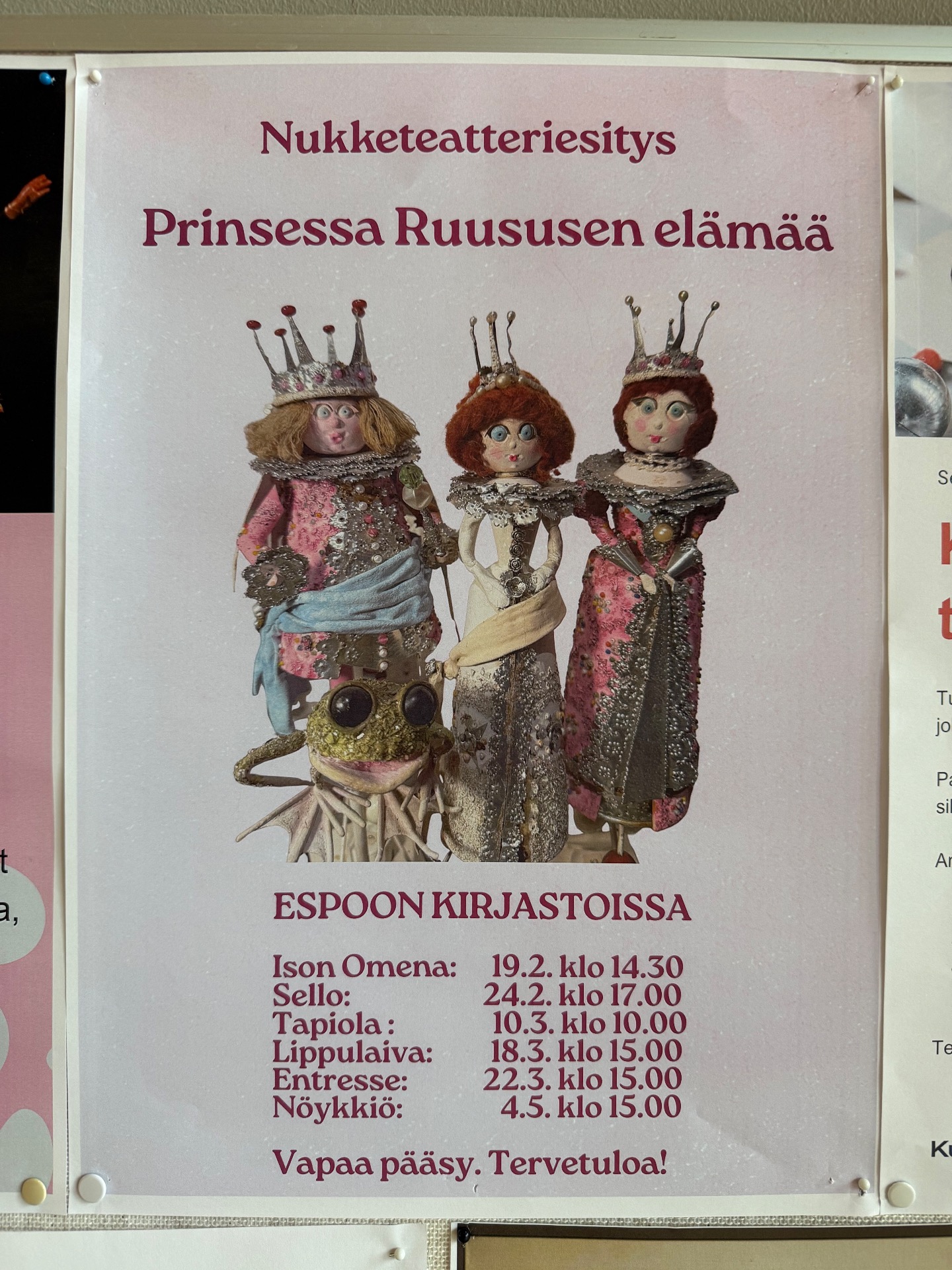 Nukketeatteriesitys kiertää keväällä 2026 Espoon kirjastoissa ja iltapäiväkerhoissa Espoon Kulttuurilautakunnan tuella.